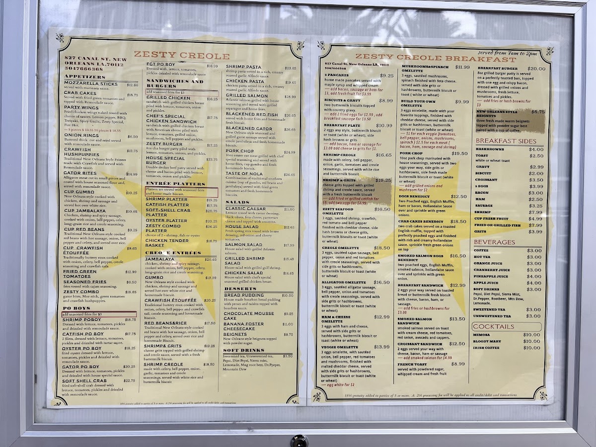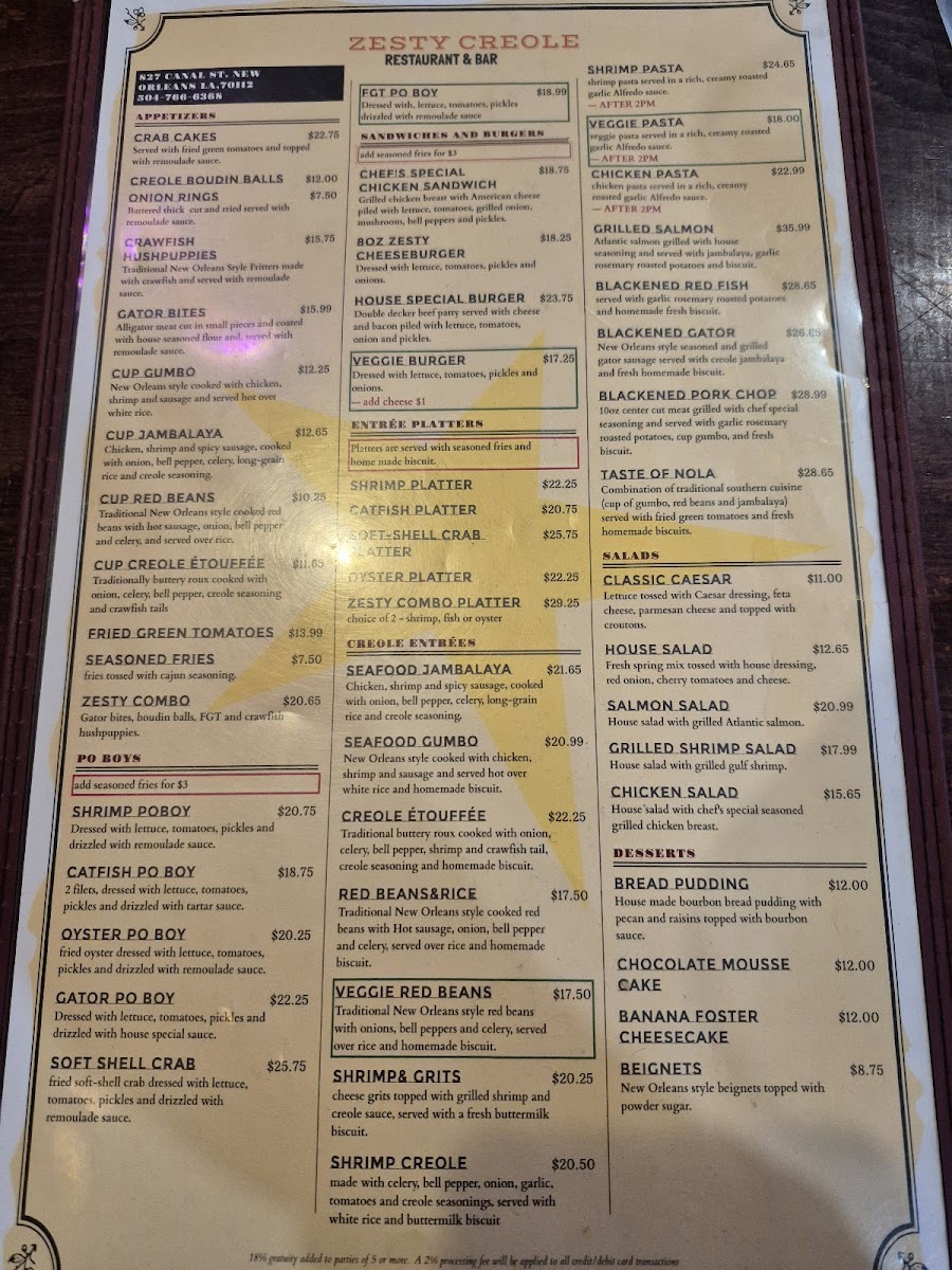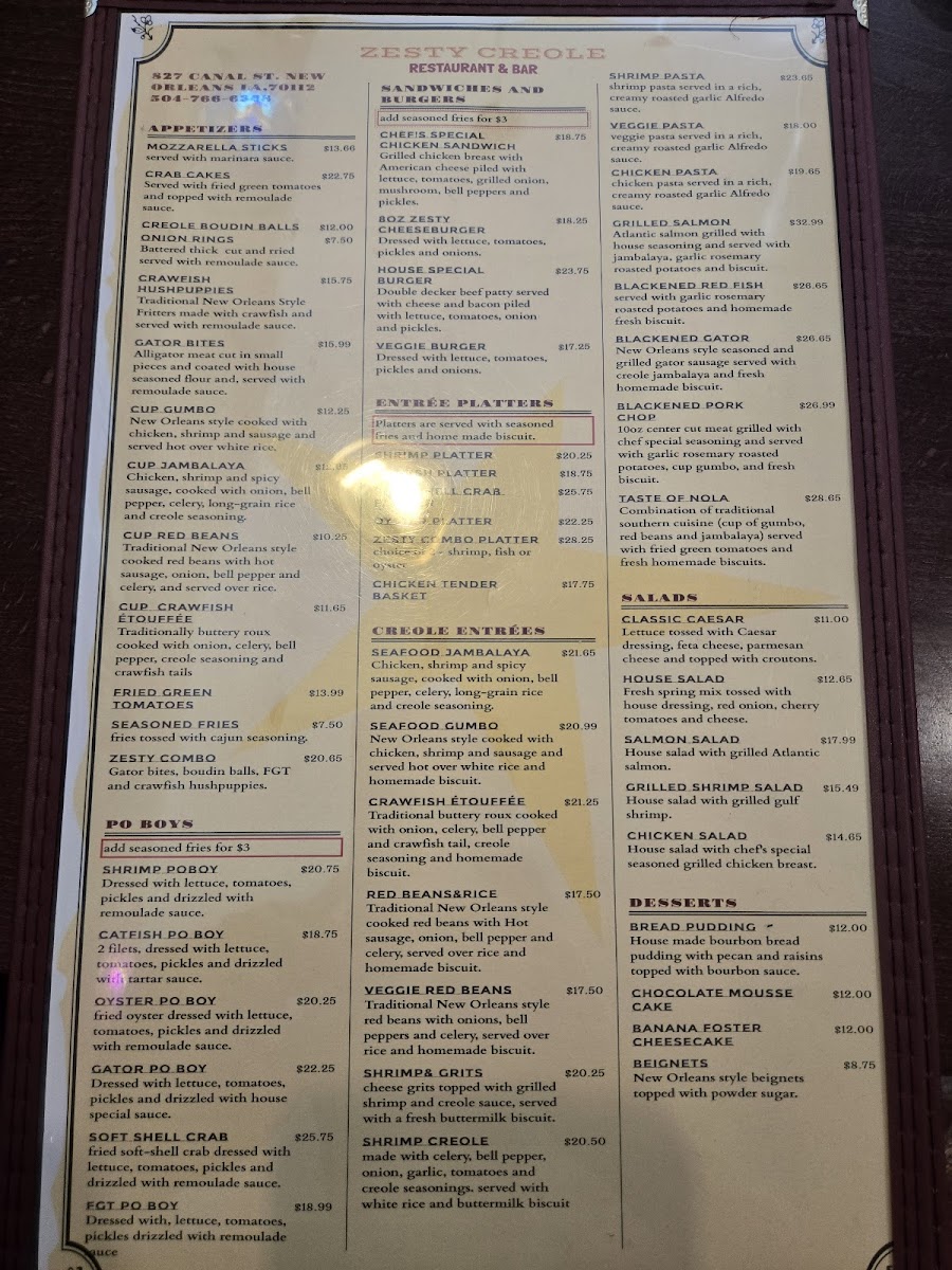Zesty Creole, nestled on Canal Street in the heart of New Orleans, offers a vibrant menu that perfectly captures the essence of Creole and Cajun cuisine. From breakfast to dinner, their diverse selection delights seafood lovers and Cajun food enthusiasts alike. Guests rave about standout dishes like the rich, hearty gumbo, crispy fried shrimp, and authentic shrimp po’boys. The sampler appetizer, featuring crawfish hush puppies, alligator bites, and fried green tomatoes with a trio of sauces, truly showcases the zest and bold flavors this kitchen delivers.