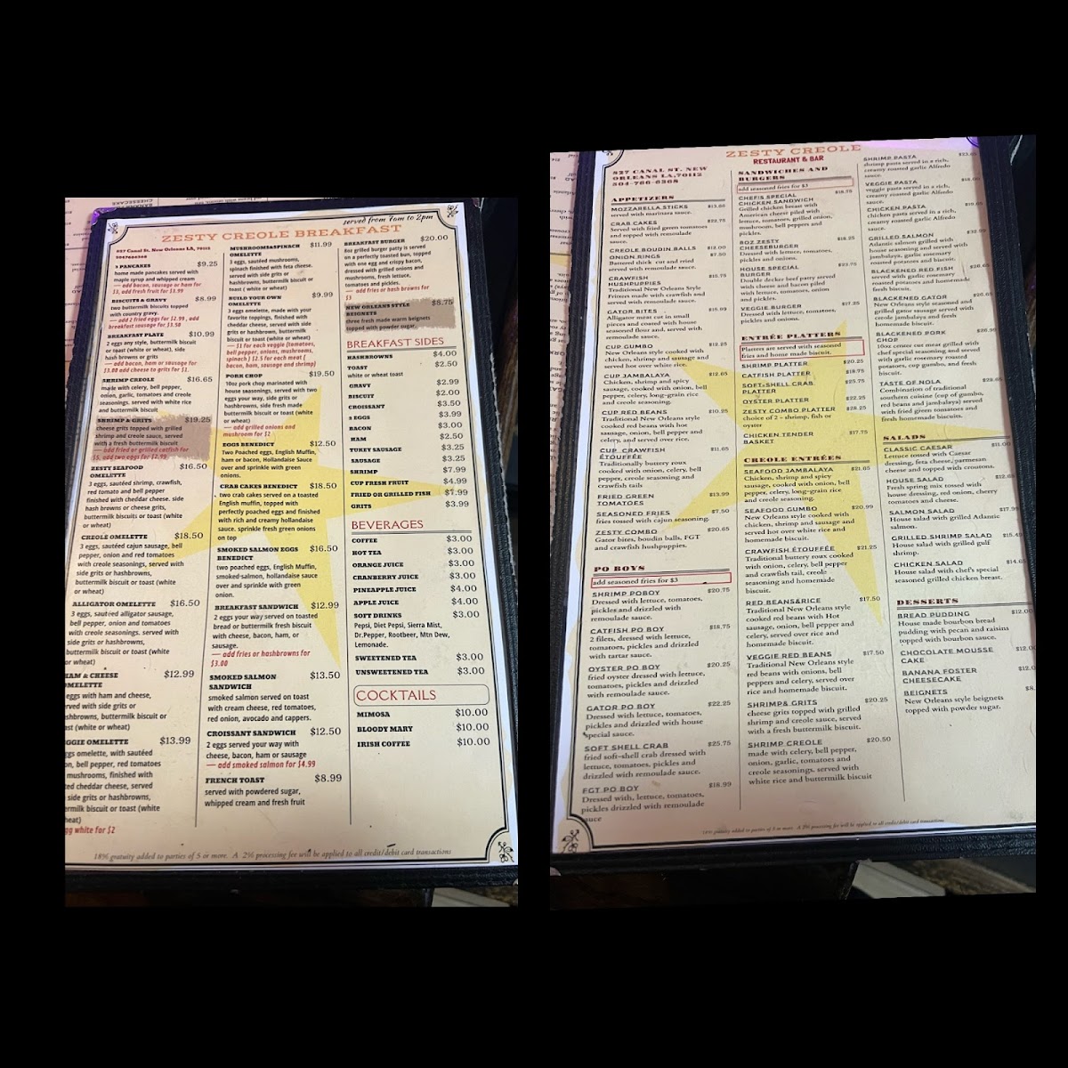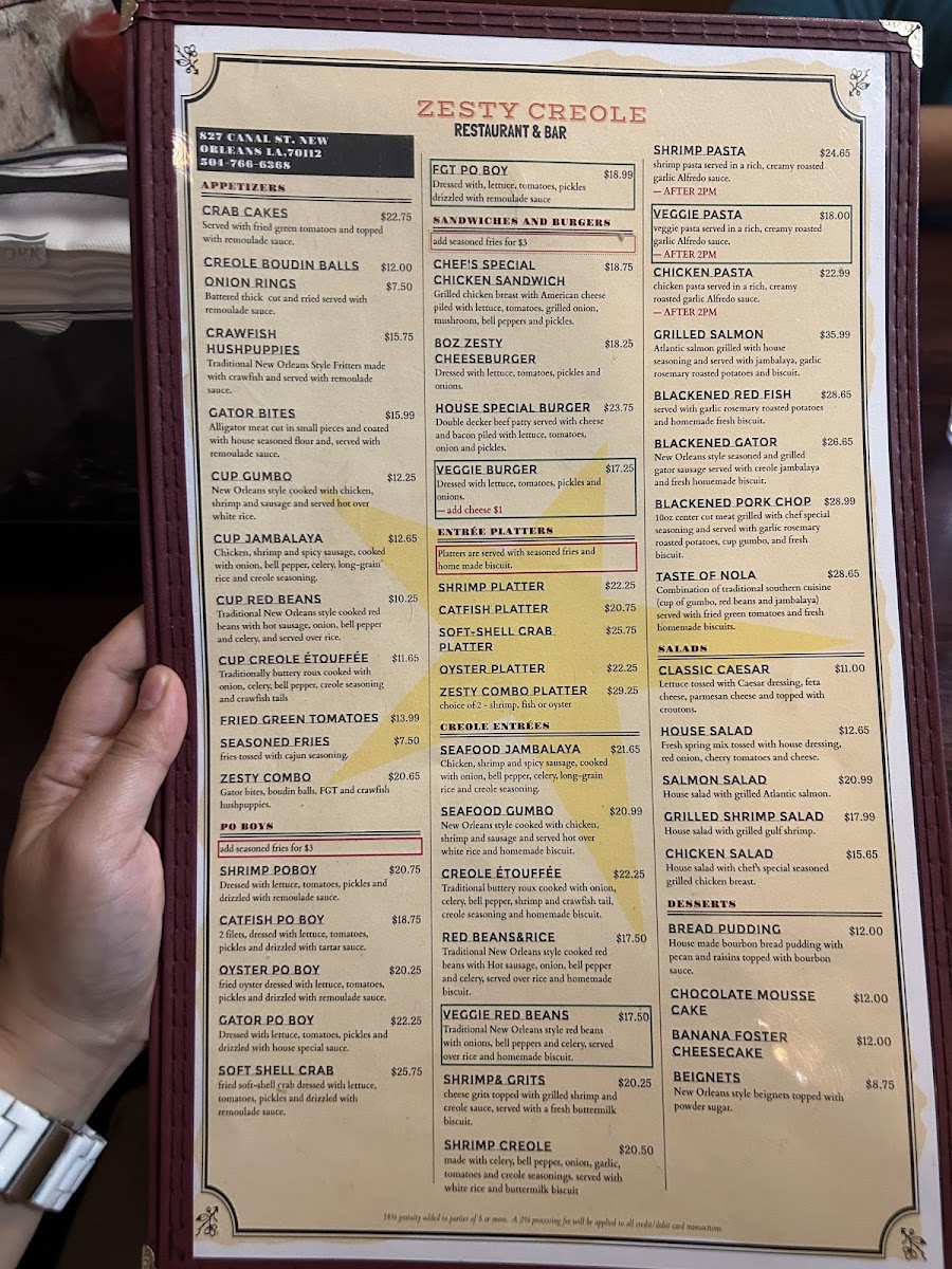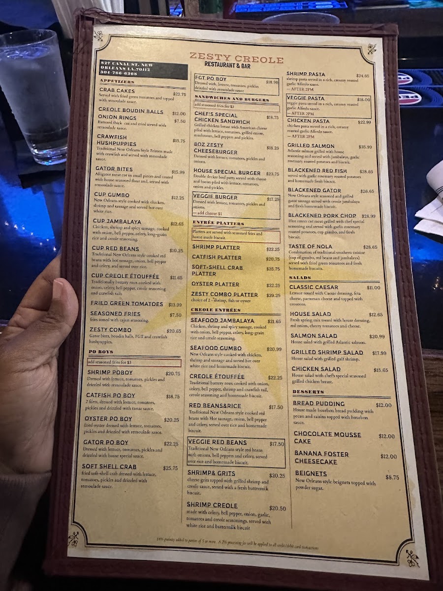Zesty Creole, nestled on Canal Street in the heart of New Orleans, offers a vibrant menu that perfectly captures the essence of Creole and Cajun cuisine. From breakfast to dinner, their diverse selection delights seafood lovers and Cajun food enthusiasts alike. Guests rave about standout dishes like the rich, hearty gumbo, crispy fried shrimp, and authentic shrimp po’boys. The sampler appetizer, featuring crawfish hush puppies, alligator bites, and fried green tomatoes with a trio of sauces, truly showcases the zest and bold flavors this kitchen delivers.